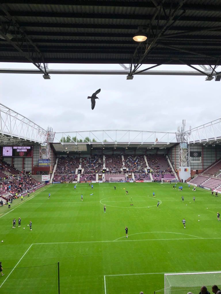 The view from the Away End at Tynecastle – with obligatory seagull in picture